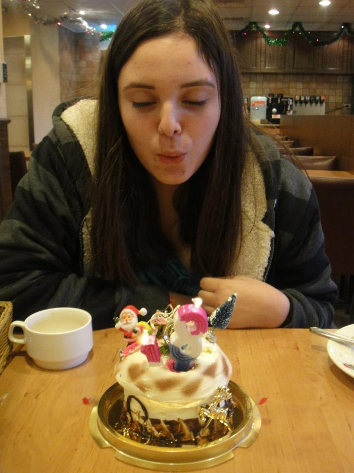 Primero, el uno se rompió y por eso está tan chaparro y hundido, jaja. Luego mientras soplaba las velitas, uno de los adornos navideños se prendió en fuego y nos medio asustamos y empezamos a morir de la risa en lugar de apagarlo, jajaja. Cuando ya por fin lo apagamos, volteamos a ahí estaba Laura muy sonriente sosteniendo la vela con el uno todavía prendido como esperando indicaciones, jajaja. Y bueno, resulta que estábamos llenísimas, porque en Pizza Hut es buffet y como está un poco caro, tienes que desquitarle, jaja; por comer tanto, ya no teníamos espacio y decidimos posponer el postre. Después de un rato empezaron a ponerle los adornos, a quitarlos, a hundirnos y acabó medio feo; cuando íbamos camino al metro, lo traía en una bolsita y en una de esas algo me preguntaron y al responder muy feliz, levanté los brazos y la bolsa dio dos o tres vueltas y salió volando, jajaja.