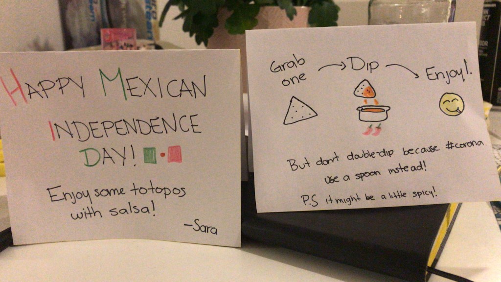 Pero mientras llega la hora de volver, traje un poco de México para celebrar. El 16 decidí compartir en el trabajo mi amor por la comida mexicana y gracias a que le aposté un bote de salsa a un amigo español, puse manos a la obra e hice salsa mexicana (que la neta me quedó deliciosa, mis compañeros no me dejarán mentir 😏), compré unos totopos de maíz azul que han sido uno de los mejores descubrimientos por acá😍 e hice unos letreritos para celebrar.